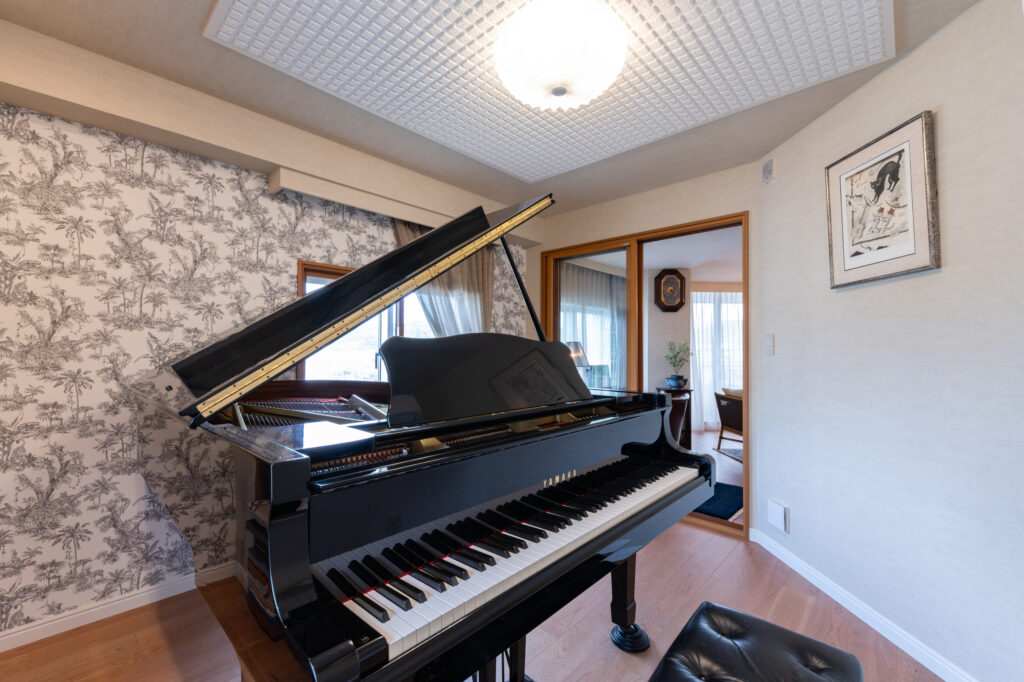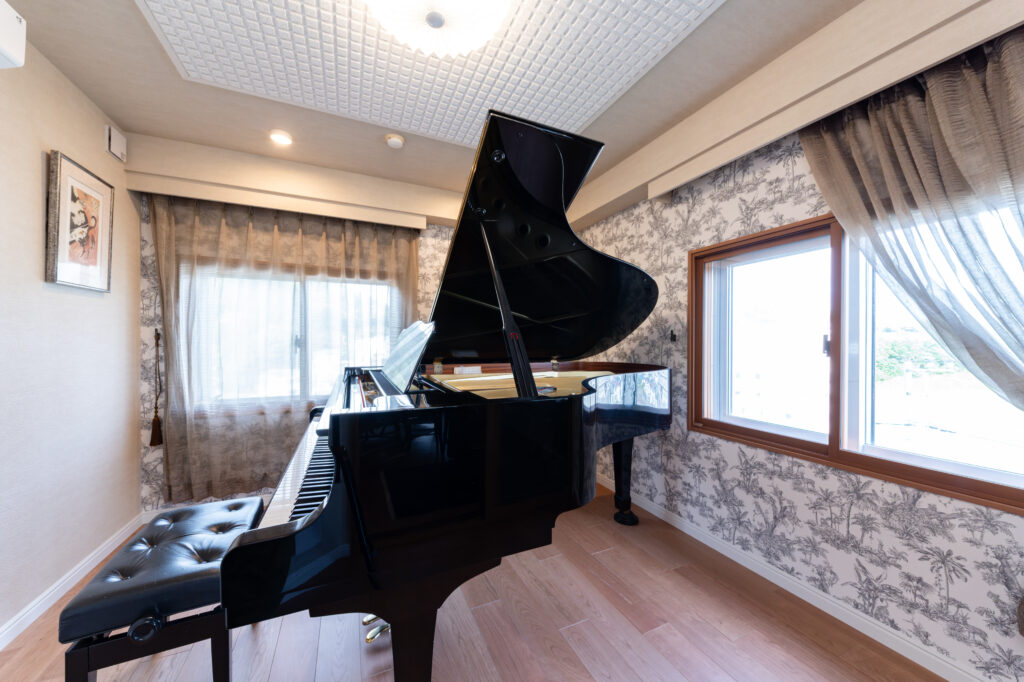 ピアノ室のサッシを開けてリビングと繋げて、弾き合い会をしたり、ご友人との時間が楽しい時間となることと思います。