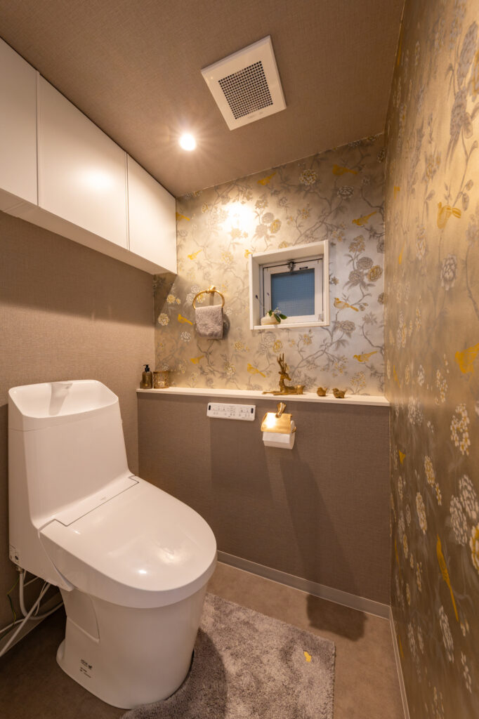 トイレはシノワズリを感じさせる小鳥のクロスに、アクセサリーのペーパーフォルダーやタオル掛けはゴールドに♡