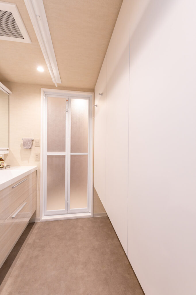 洗面台の背面には大きな収納棚を作ったのですが実は床から50センチ程度浮かせています。