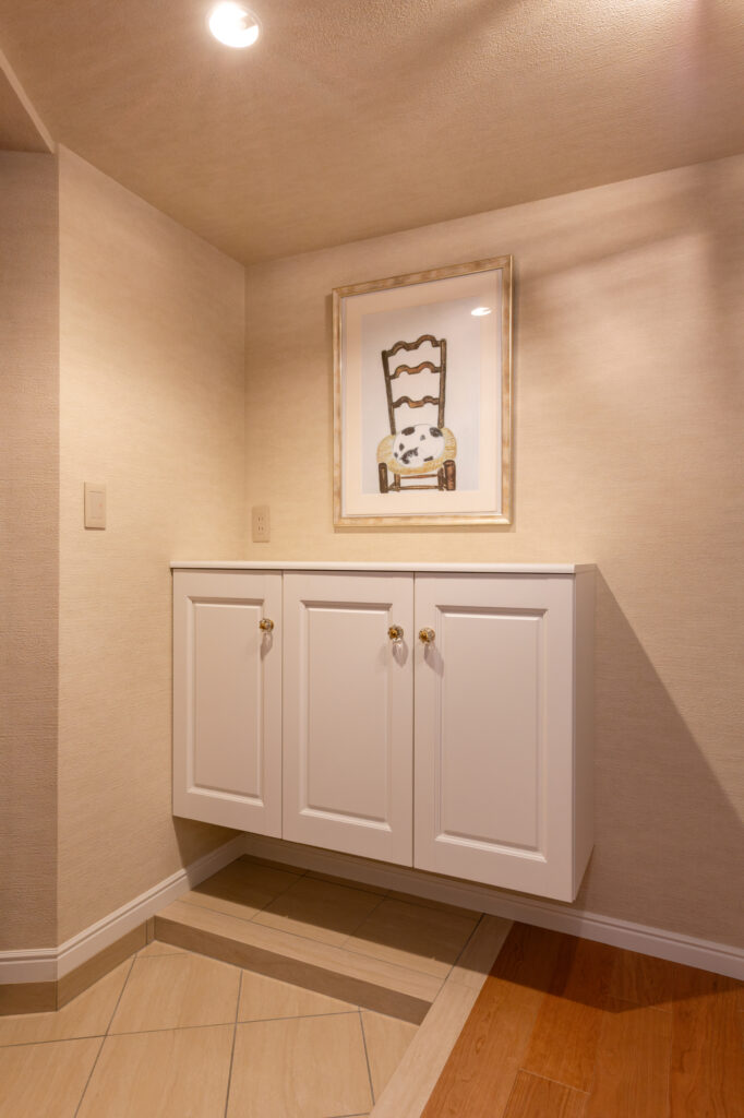 シューズボックスや扉は、チョコレートのような可愛らしい框のデザインとしました。