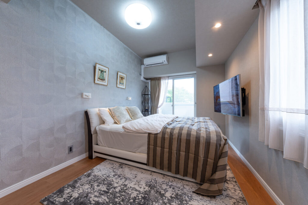 主寝室は他のお部屋と少し雰囲気を変えて、グレーをベースとした落ち着いた空間としました。